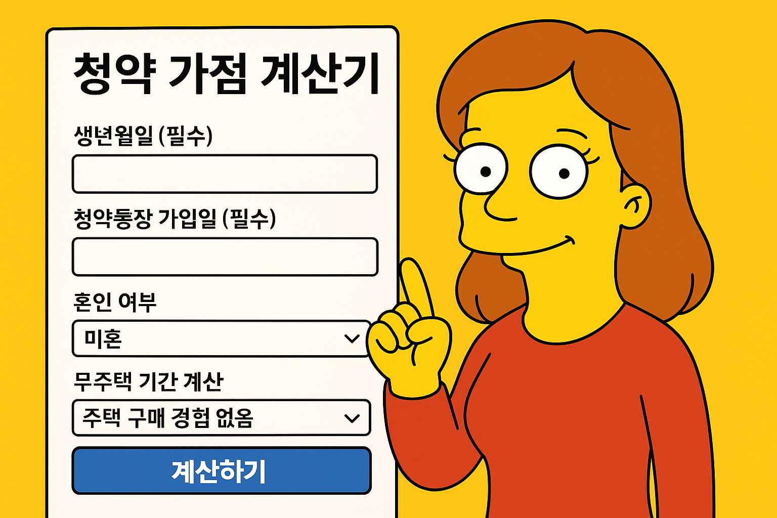 🏠 청약 가점, 복잡하지 않게 1분 만에 계산하기!청약홈이나 다른 사이트들의 청약 가점 계산기를 들어가 보면, 점수를 계산하기가 너무도 복잡해 보여요 :(아래 계산기를 통해서 간편하게 계산해 보세요!*서울 민간 아파트 청약 당첨: 평균 약 63점*서울 강남 3구 (강남, 서초, 송파) 청약 당첨: 평균 72점 실질적으로 부양 가족이 많지 않으면 청약 가점을 높이 받기 어렵기 때문에, 특별공급 (신혼부부, 생애최초, 다자녀 등)을 유심히 살펴 보는걸 추천합니다 :)#청약 가점 계산 3단계 (만점 84점)내 청약 가점 = 무주택 기간 점수 + 부양가족 점수 + 청약통장 가입 기간 점수1. 무주택 기간 (최대 32점)지금까지 집을 소유한 적 없는 기간이 몇 년인가요?만 30세부터, 혹은 결혼일부터 계산합니다..