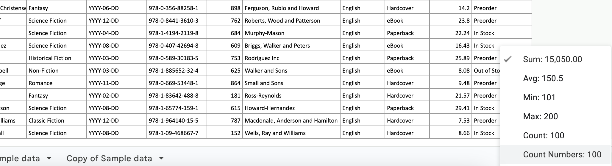 우측 하단에 보시면 Sum이 기본값으로 되어있을텐데 해당 부분을 클릭하시면, Count에 전체 100개라고 나와서 간단하게 확인할 수 있습니다.