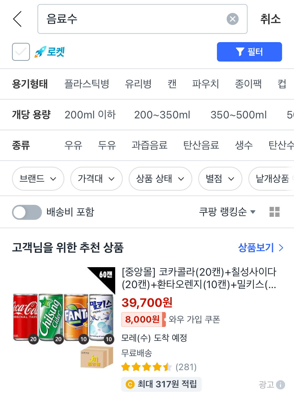 [음료수]라고 검색을 해보면 아래와 같이 검색이 되기에, 기본적인 메타데이터 구성을 예상해 볼 수 있습니다.