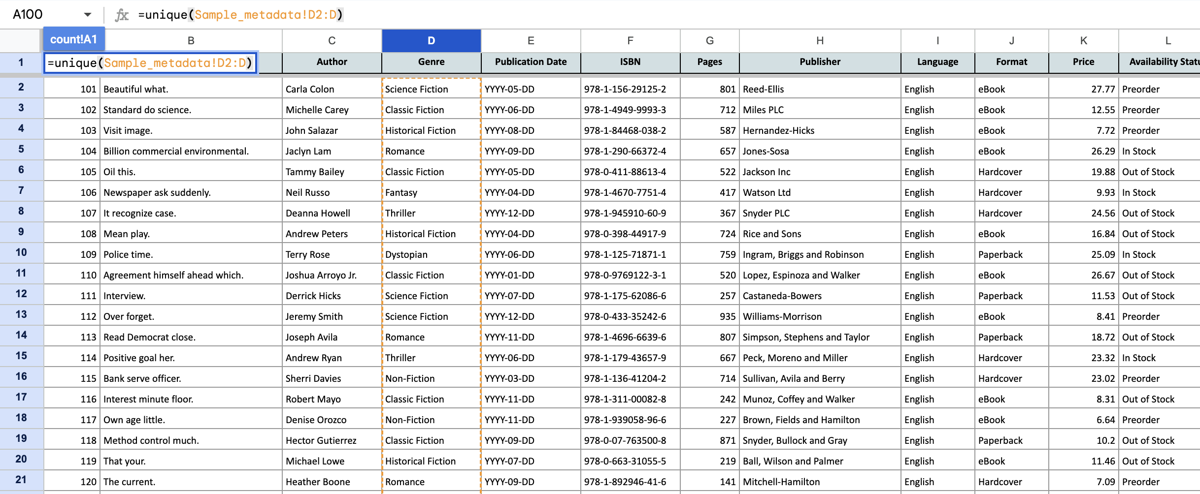 - 요구사항: 메타데이터에서 도서의 장르가 몇 개나 있는지 알고 싶다. (Romance, Fantansy, ...)